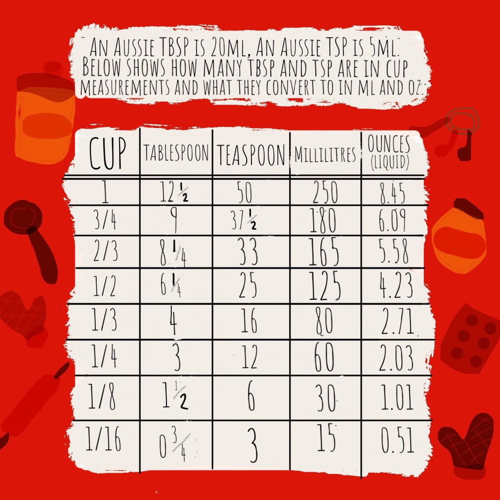 I will be doing a post on this at a later date, but as a quick guide, 4 Aussie tsp (5ml) make up one Aussie tbsp (20ml) and only 3 Aussie tbsp make up 1/4 cup.