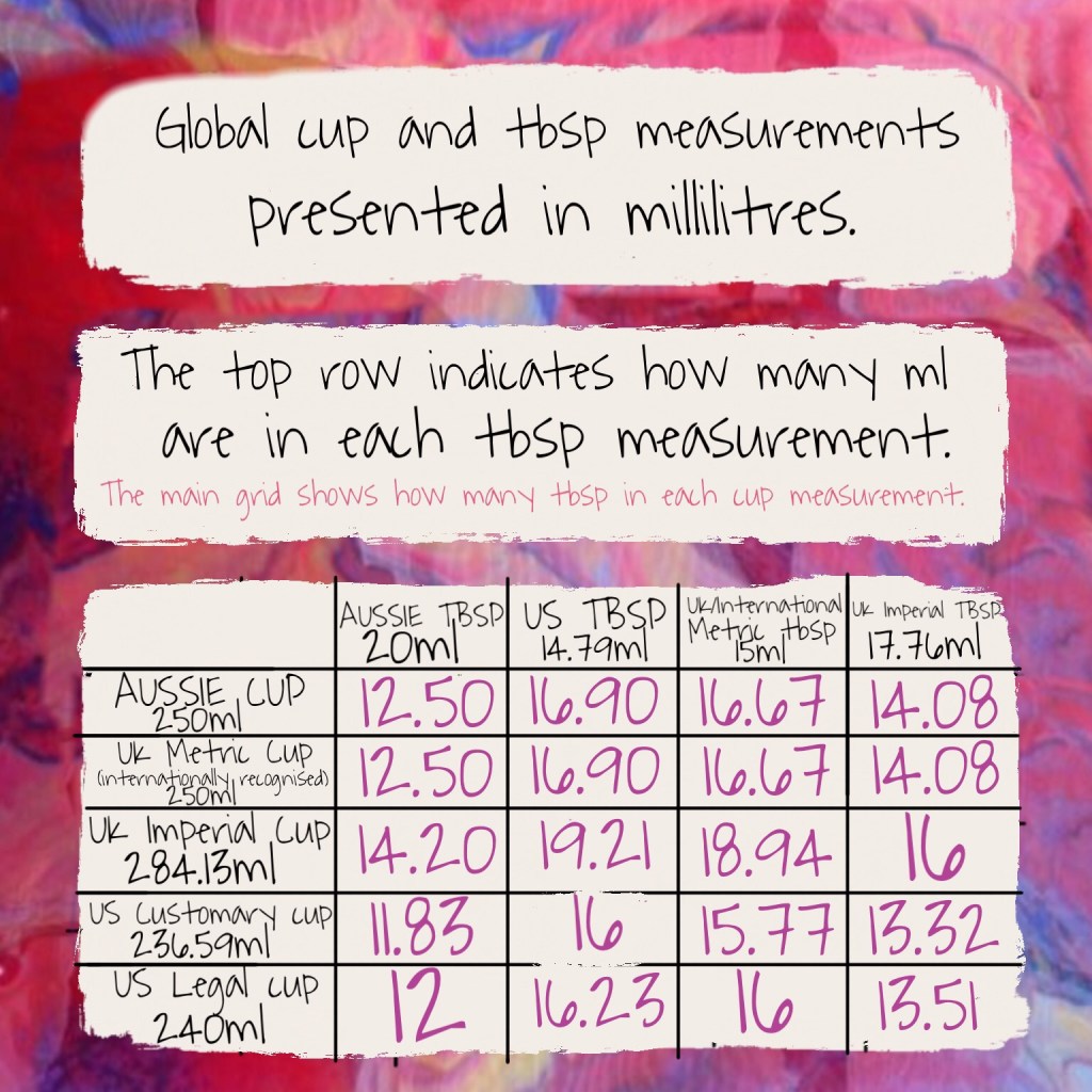 The second chart quickly converts the 1 cup measurement (recorded in millilitres) to tbsp, for my global readers. As my recipes use Australian Metric Measurements and I often use metric cups, it’s a good idea to check out the global conversion chart.